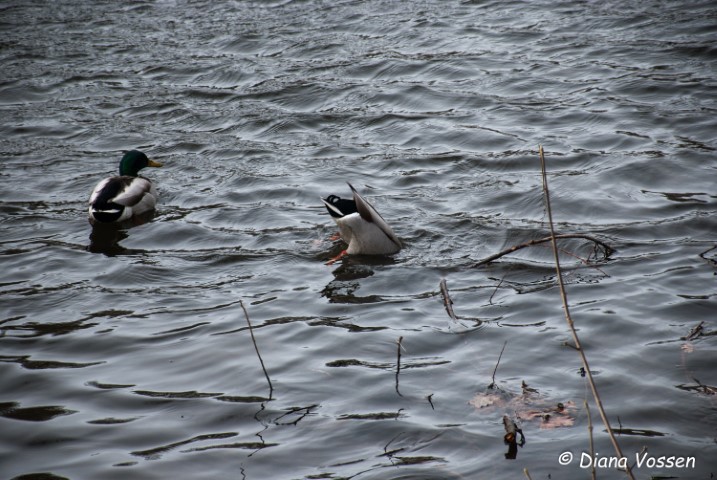 Er zwemmen twee eenden in het water. Plotseling duikt een eend met zijn kop onder water. We zien alleen nog zijn staart. Dan komt hij weer boven water en heeft iets groens in zijn bek. Het lijkt wel gras. Het zal wel een stukje van een waterplant zijn. Dat zal wel smaken.
