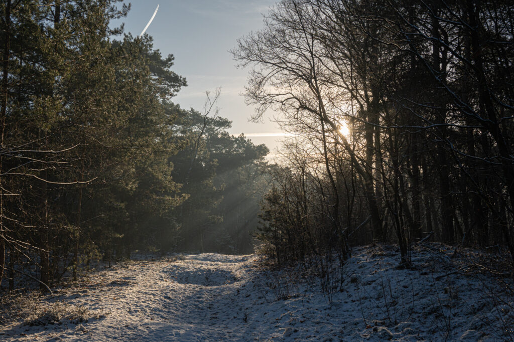 Tussen de bomen door scheen de zon en dit gaf van die mooie stralen. Het was heerlijk stil en rustig met af en toe een overscherende fluitende vogel.